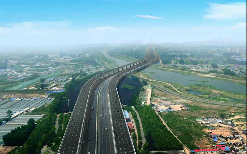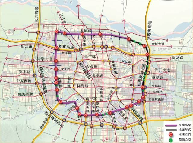 鄭州市四環(huán)線及大河路快速化工程為由大河路、東四環(huán)、南四環(huán)及西四環(huán)組成閉合環(huán)線,路線全長約93.030km。全線采用城市快速路路標準,規(guī)劃控制總寬度180m(其中道路紅線寬80m,兩側(cè)各有50m寬綠化帶),西西四環(huán)、大河路(107輔道以西段)、南四環(huán)采用高架快速路形式,標準橫斷面組成為:高架快速路(雙向八車道)+地面主干路(雙向八車道)+輔路:大河路(107輔道以東段)、東四環(huán)采用地面快速路形式,標準橫斷面組成為:主線地面快速路(雙向十車道)+輔路。全線高架快速路長63.624km(新建56.536km,現(xiàn)狀7088km),地面快速路長29.406km;共設置27座互通立交,其中新建立交15座(改造現(xiàn)狀立交7座,利用現(xiàn)狀立交5座),37對上下匝道,8座隧道(下穿通道);全線與河(渠)交叉21處,與鐵路交叉12處(其中下穿高鐵8處,上跨普鐵4處),與軌道交通線交叉22處。